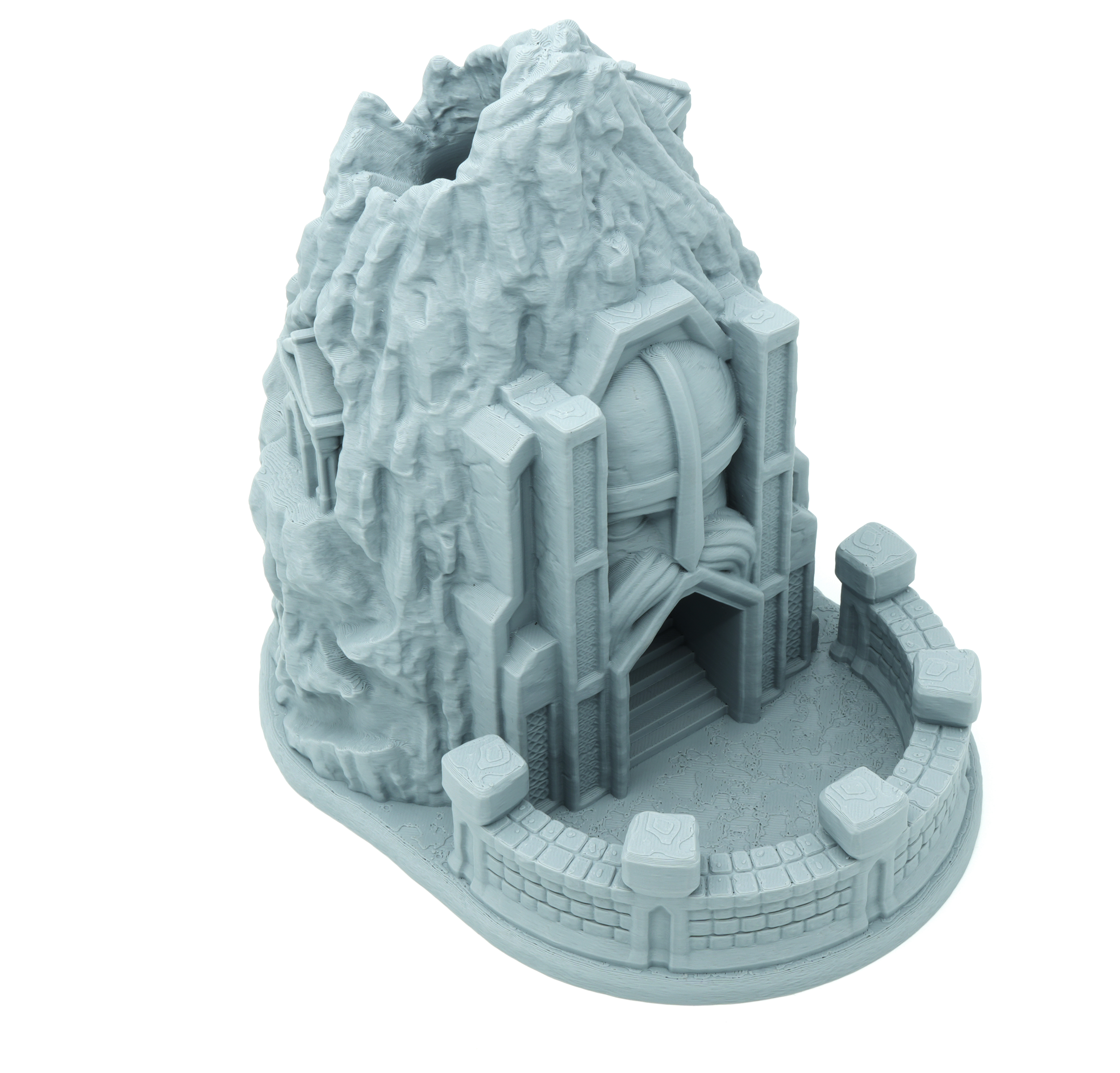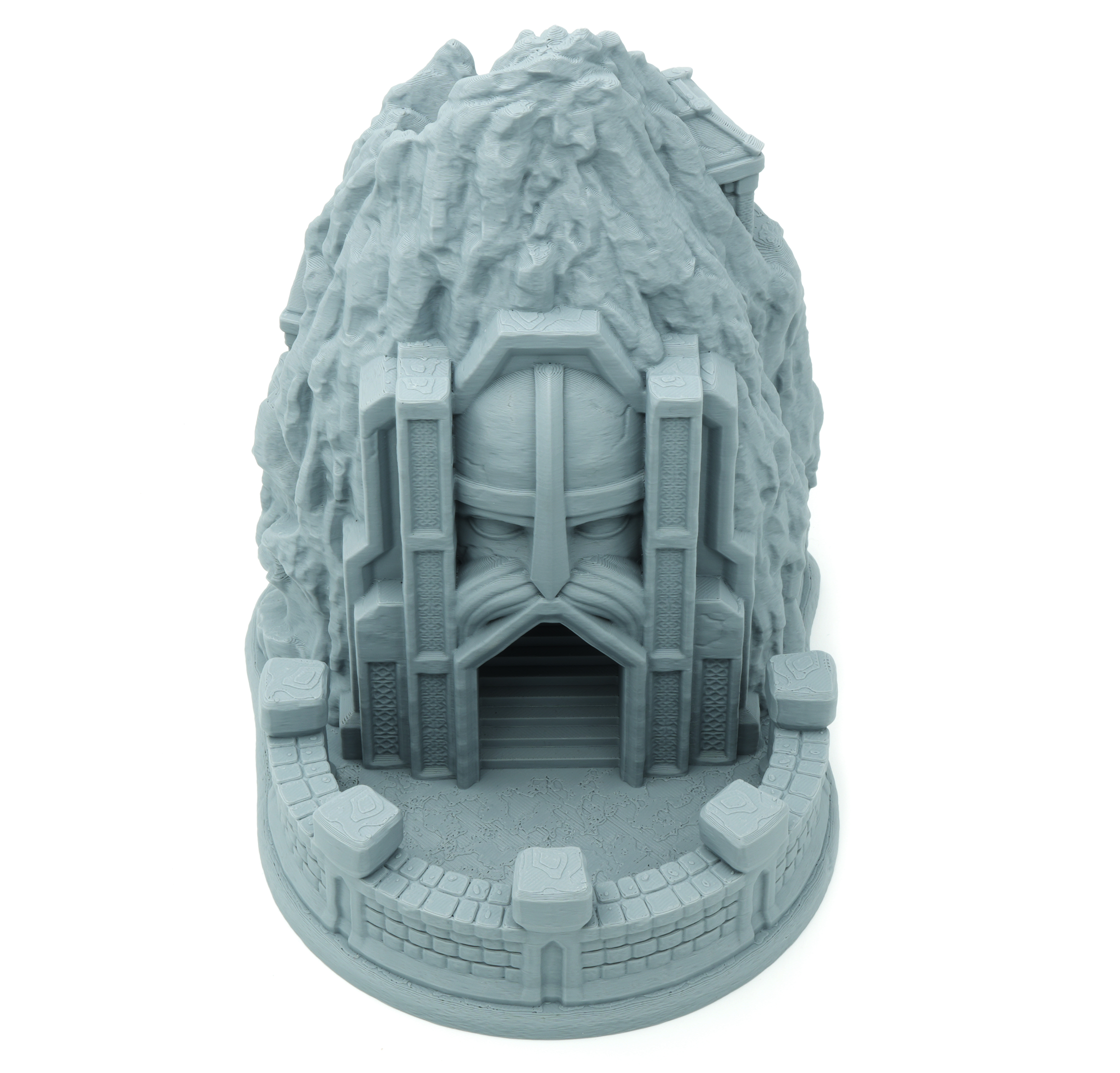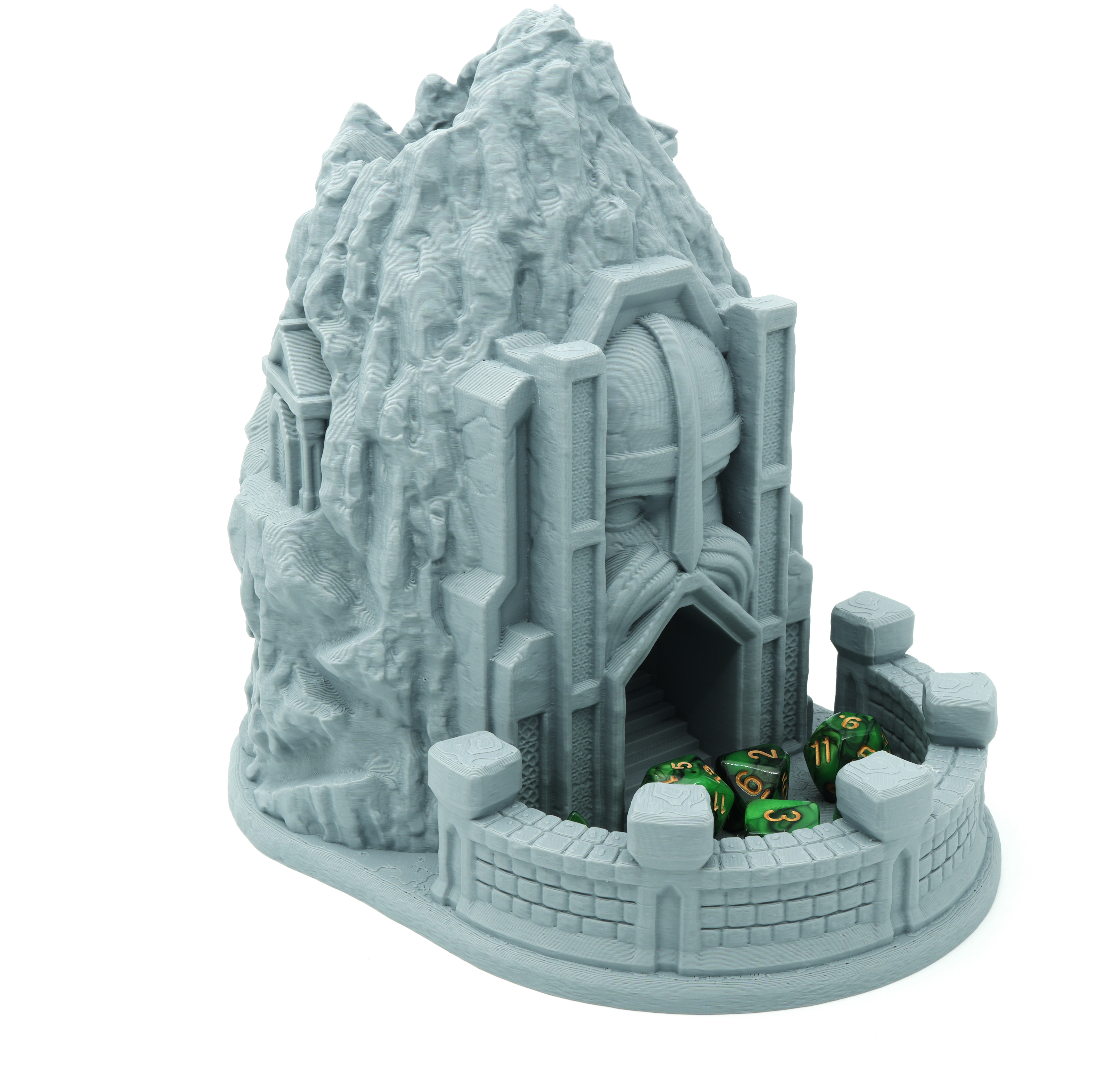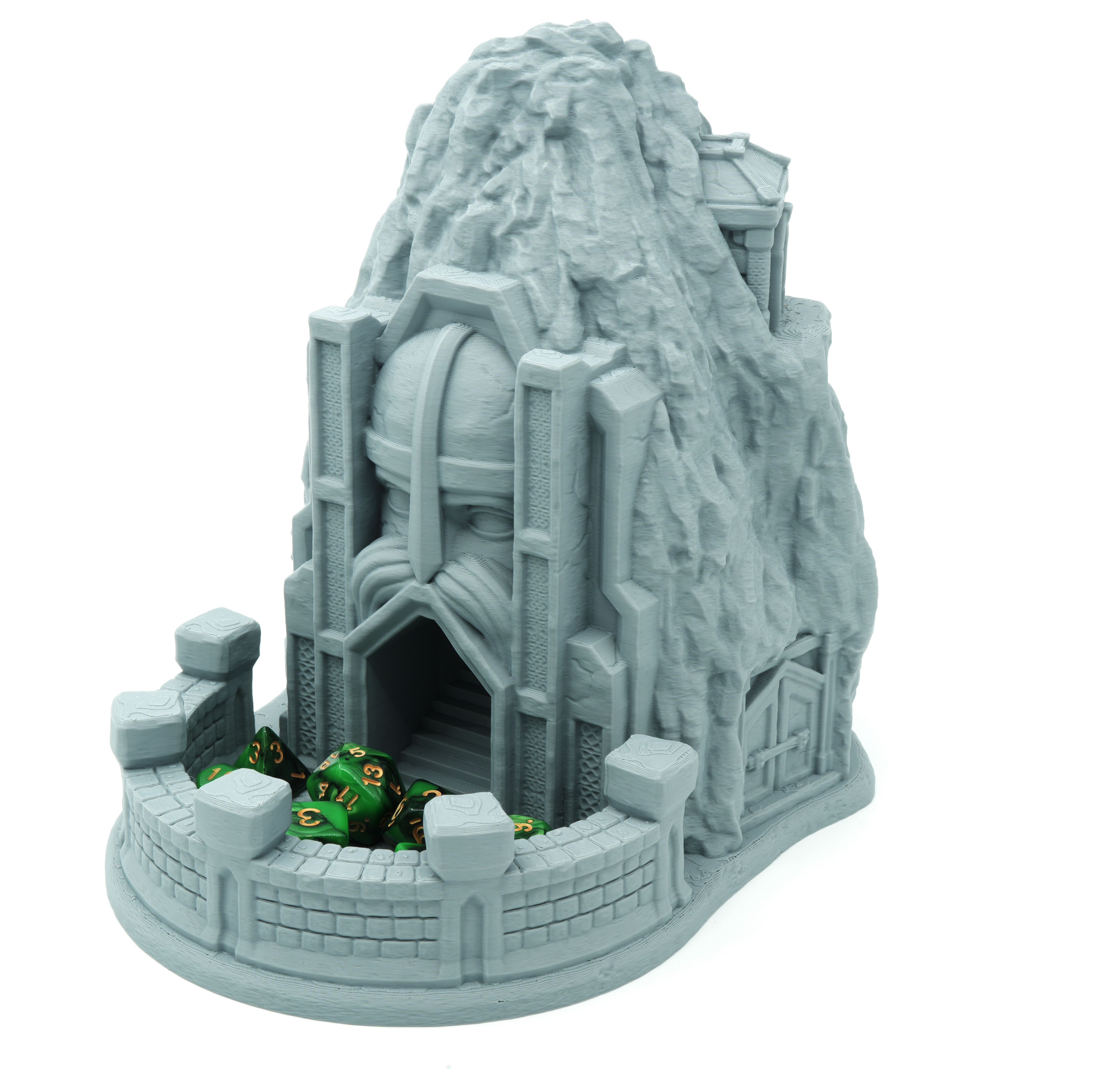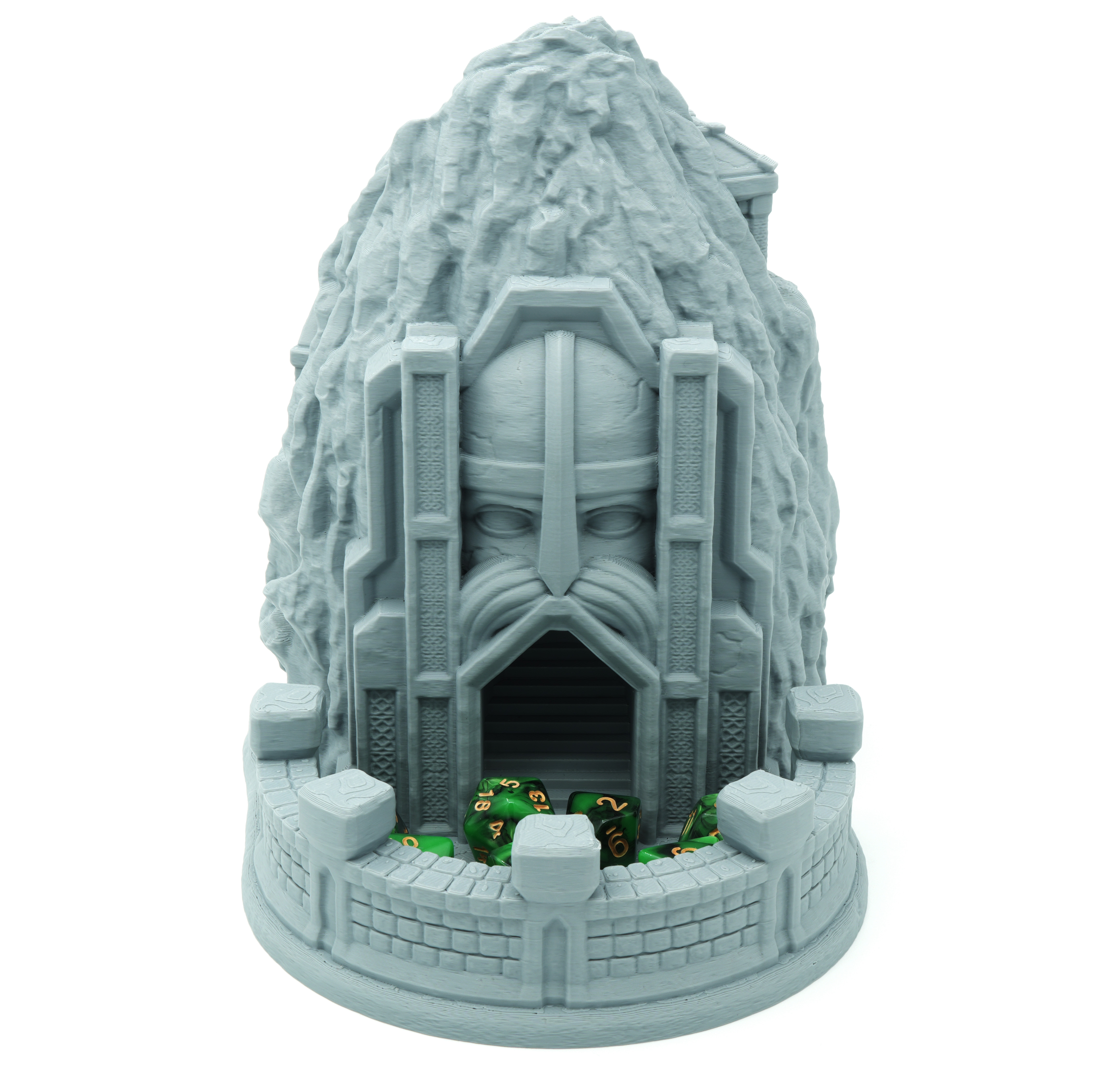 A powerful, monumental dice tower that looks like a dwarven guardian carved directly into the rock.