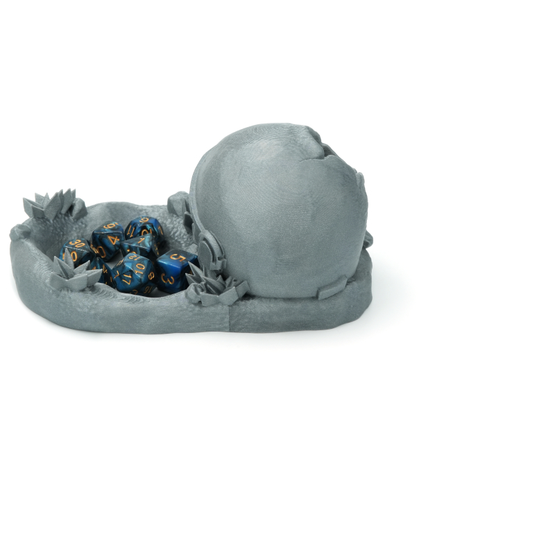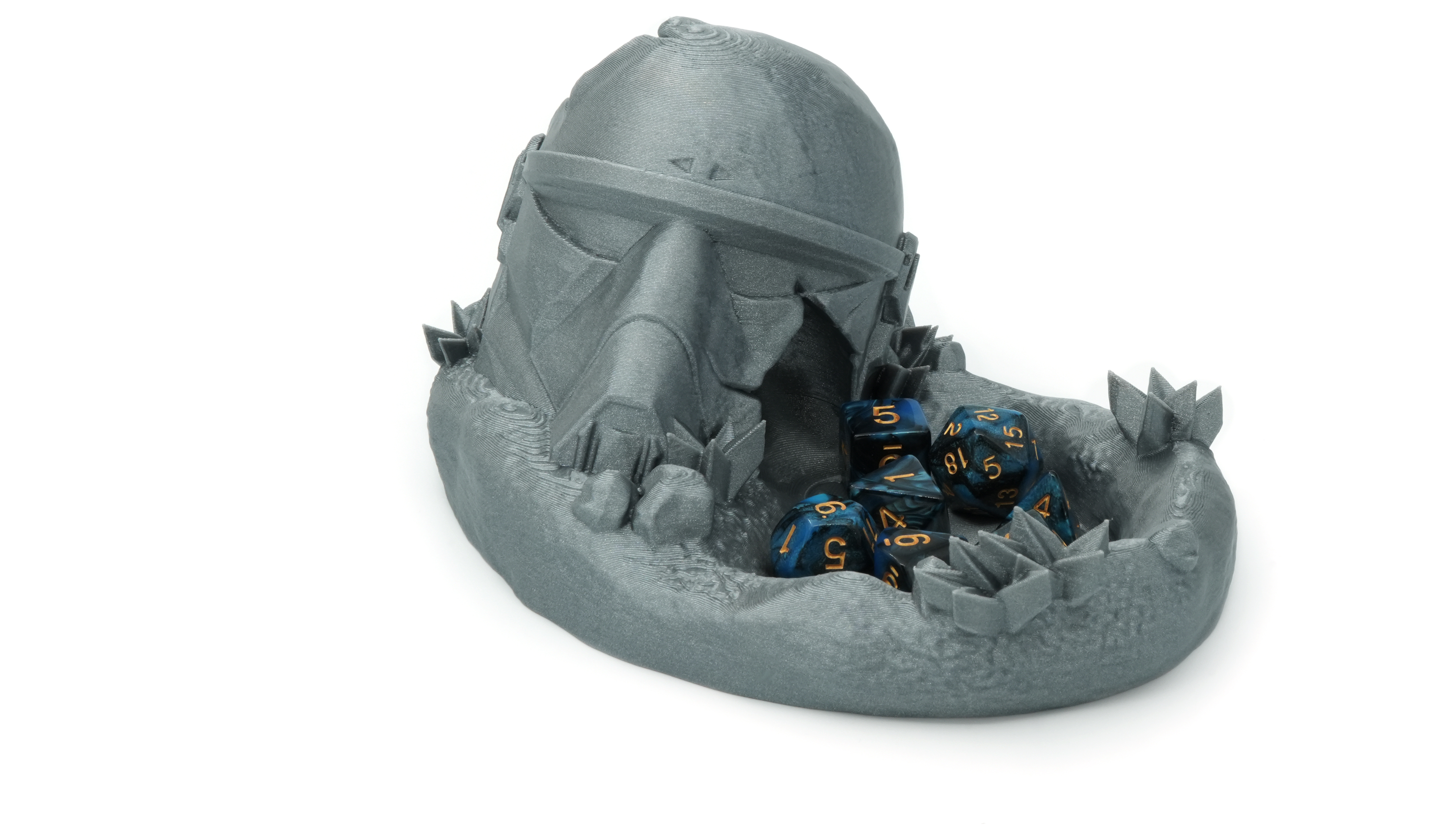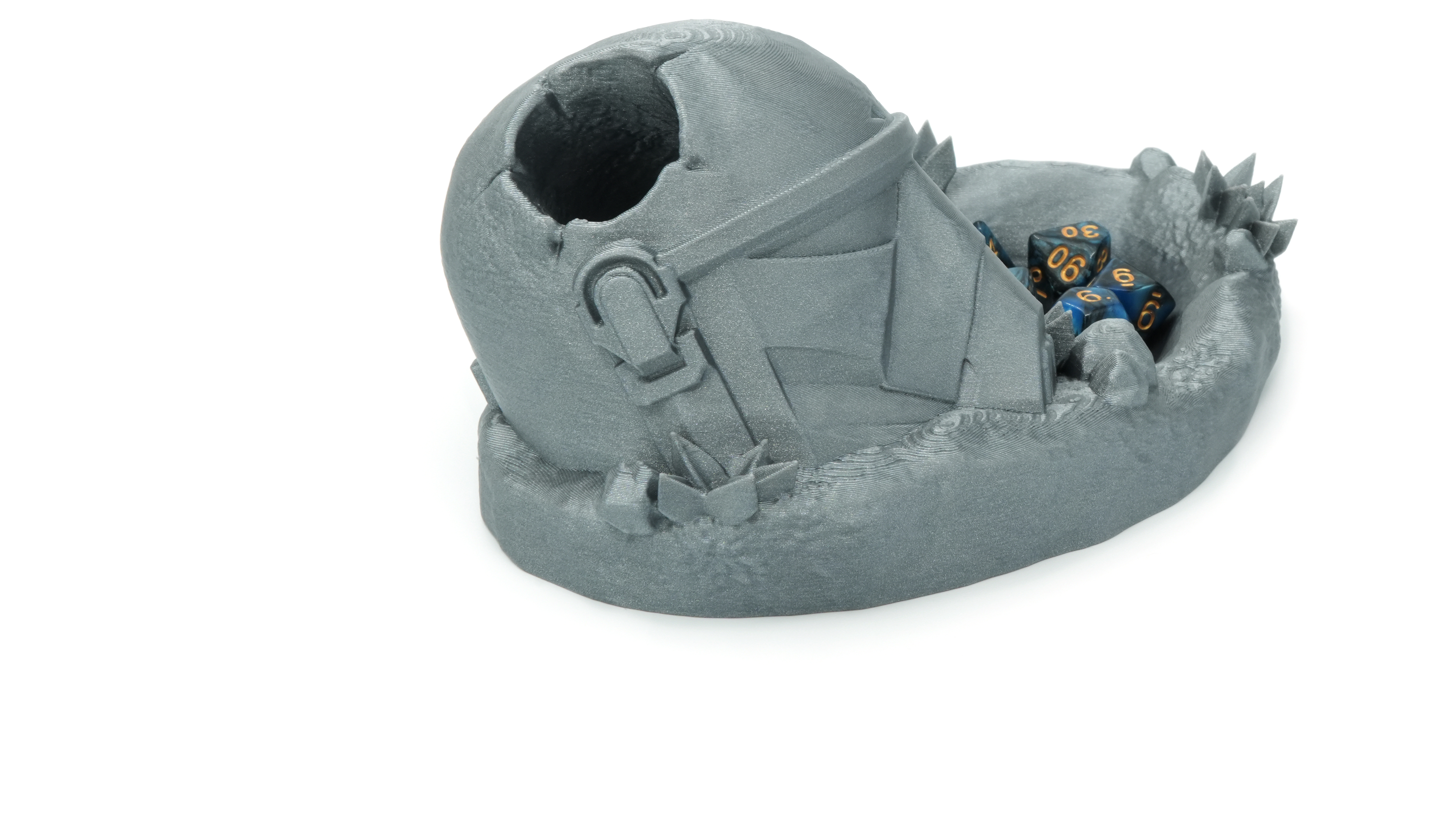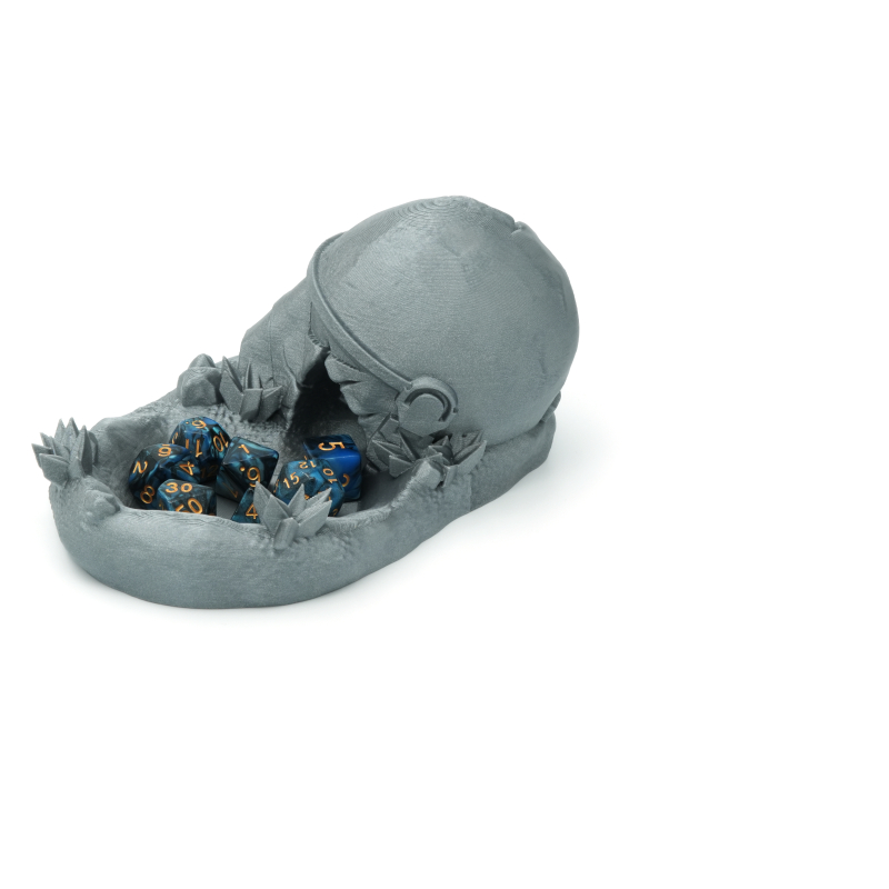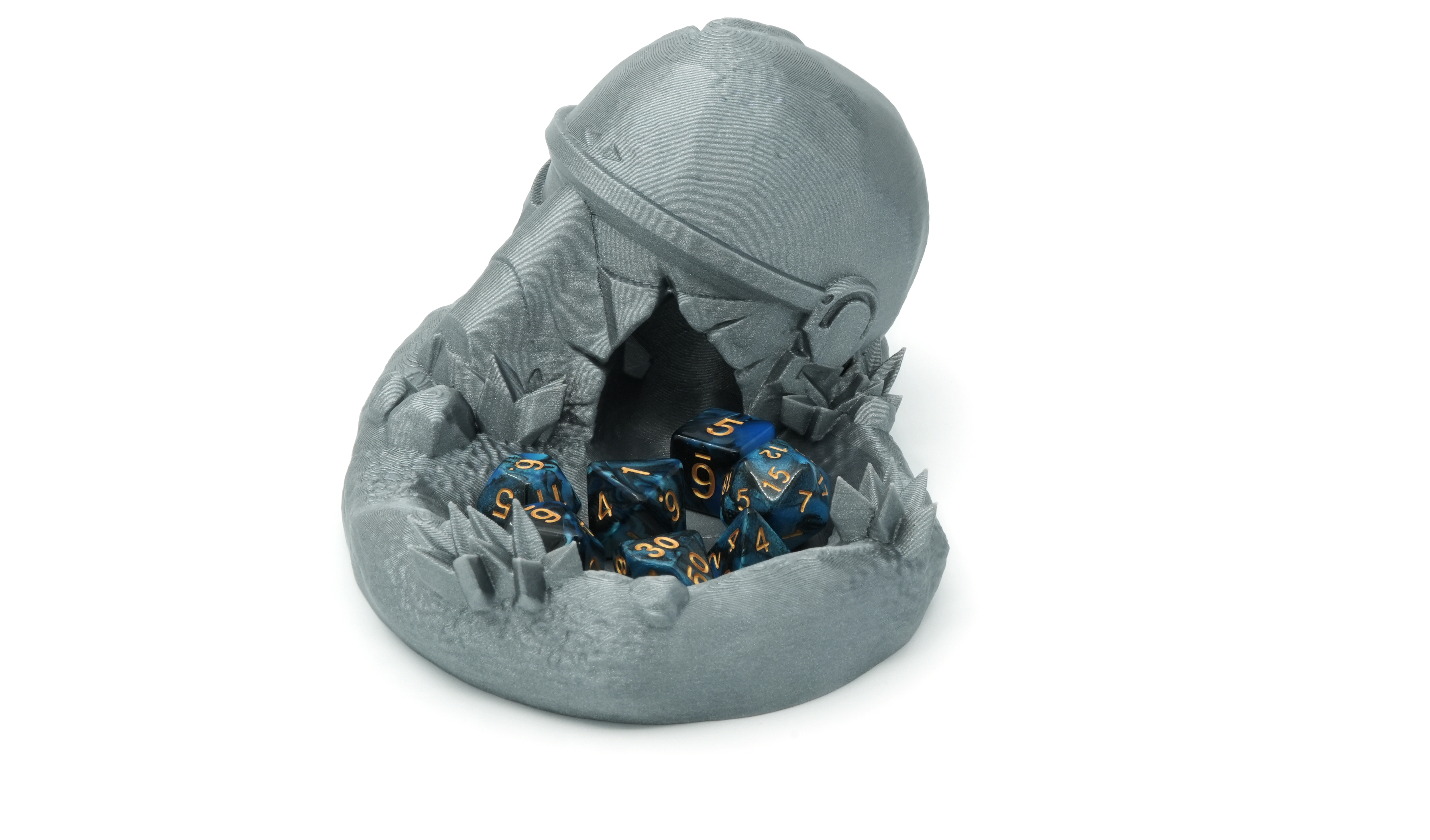 Dice are thrown through an opening at the top of the helmet, then roll through the interior and exit at the back, landing directly in the stylish, themed dice tray. 🔄⚙️