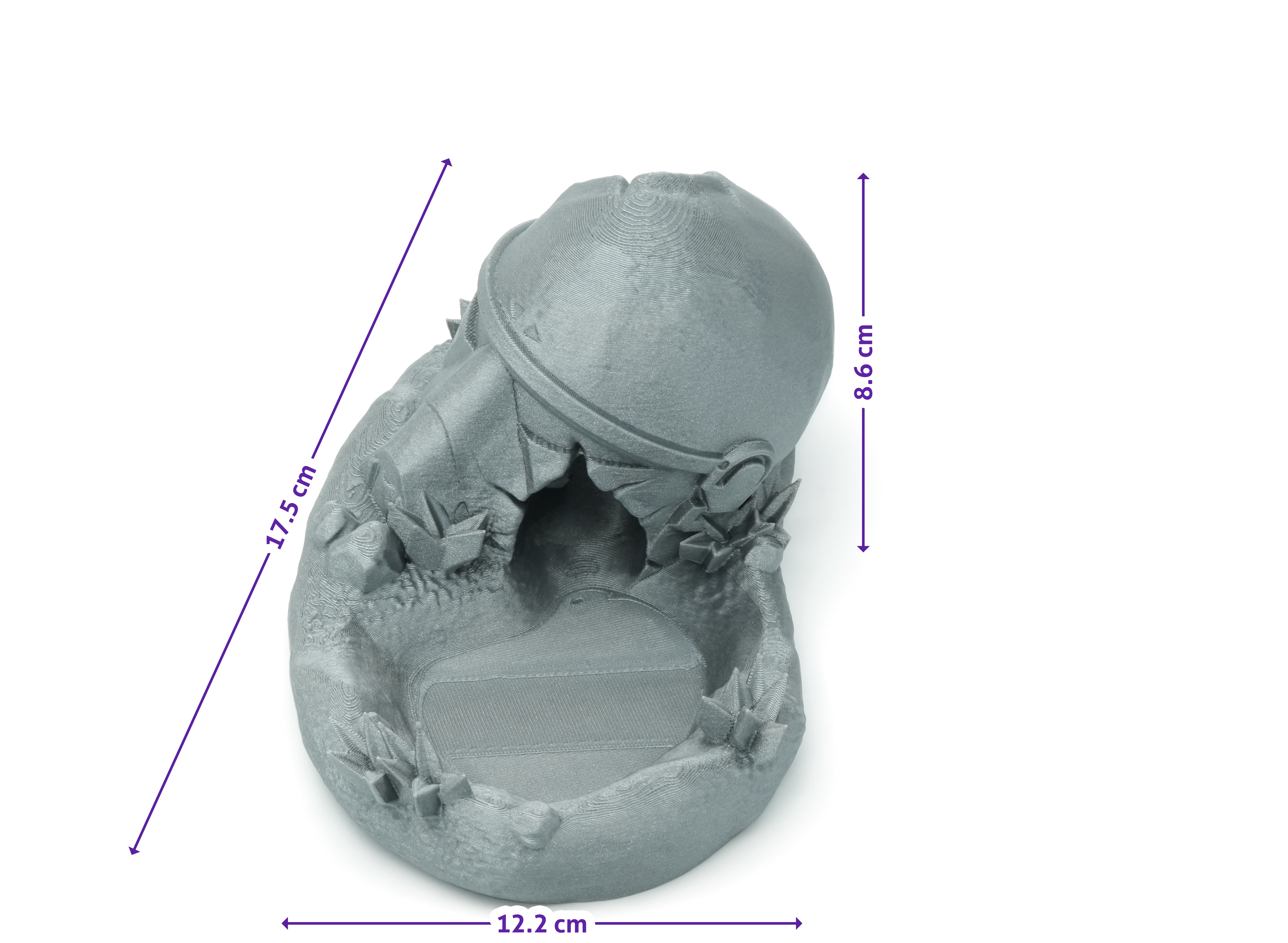 The tower stands only 8.6 cm tall, but has a width of 17.5 cm thanks to the built-in dice tray, making it both compact and practical.