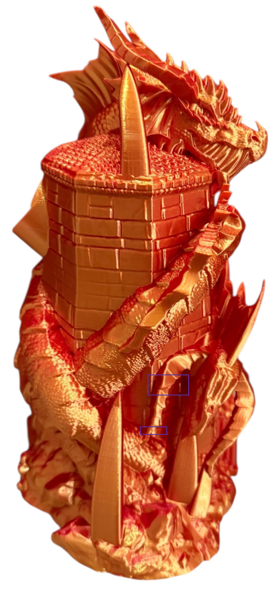 Ta technologia charakteryzuje się tworzeniem produktu warstwa po warstwie, przez to z bardzo bliska na wydruku zobaczysz warstwy i malutkie przerwy między nimi.