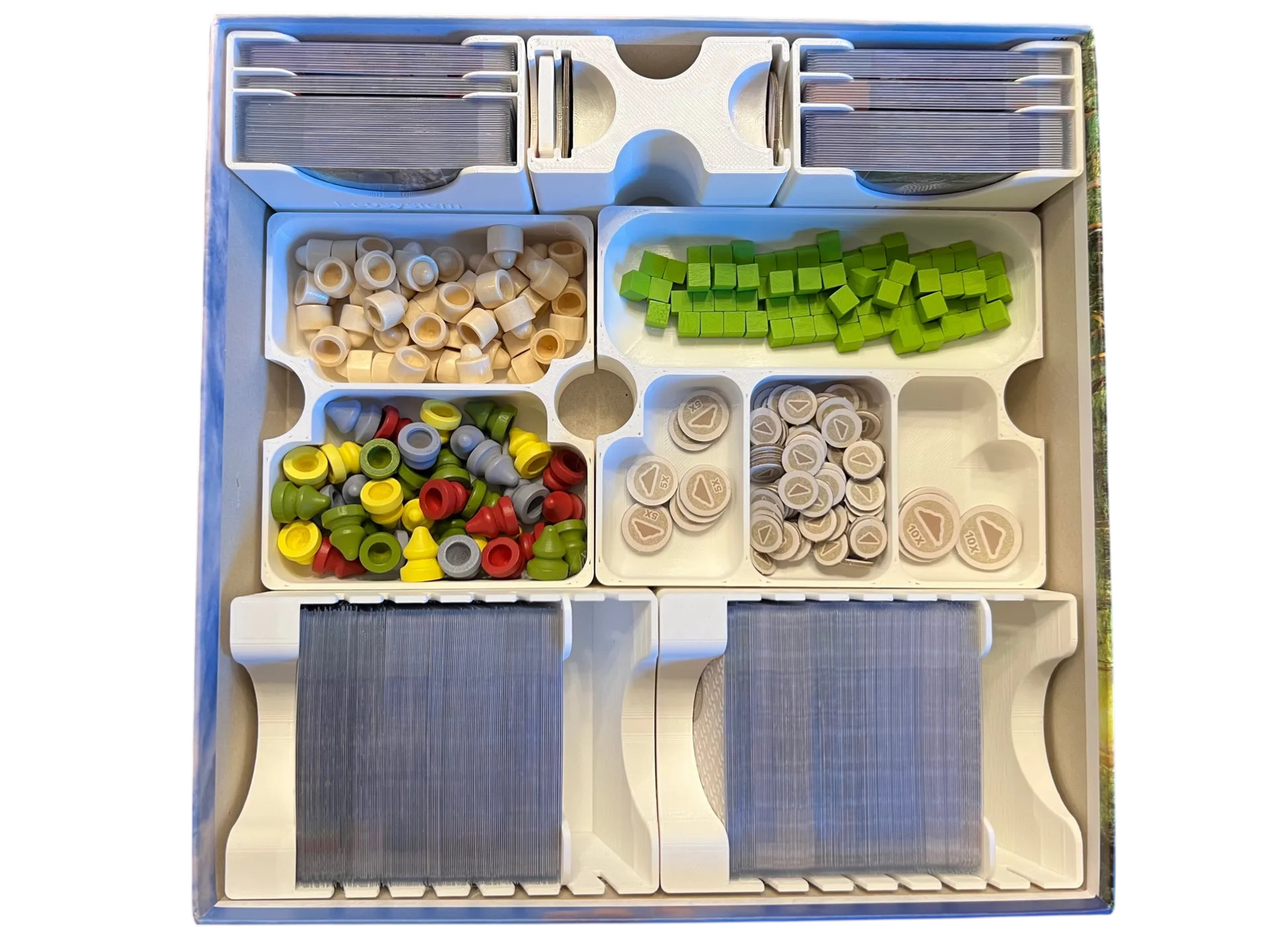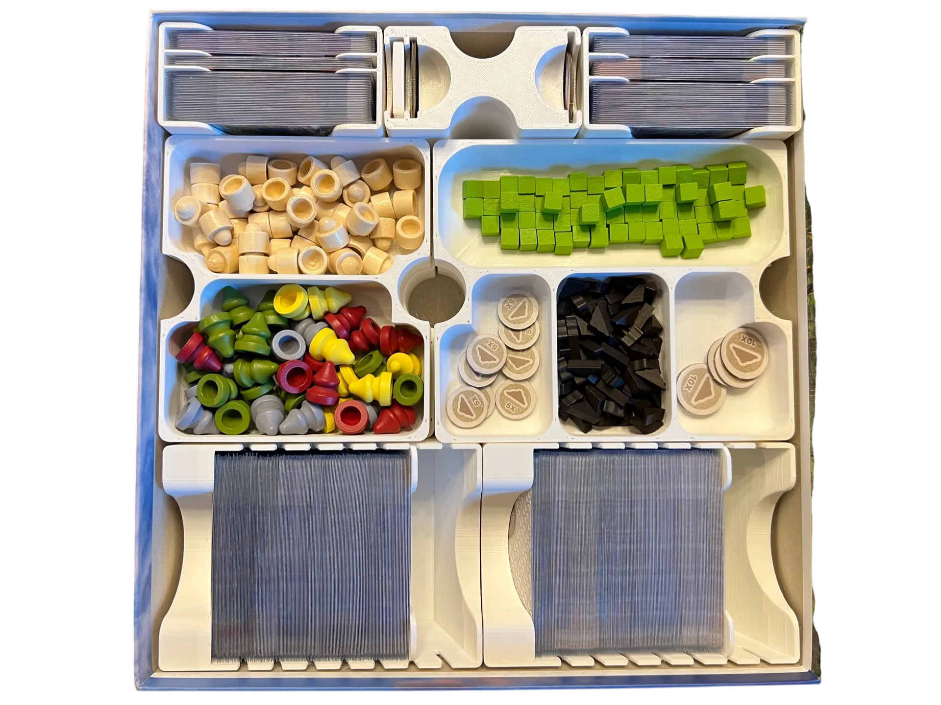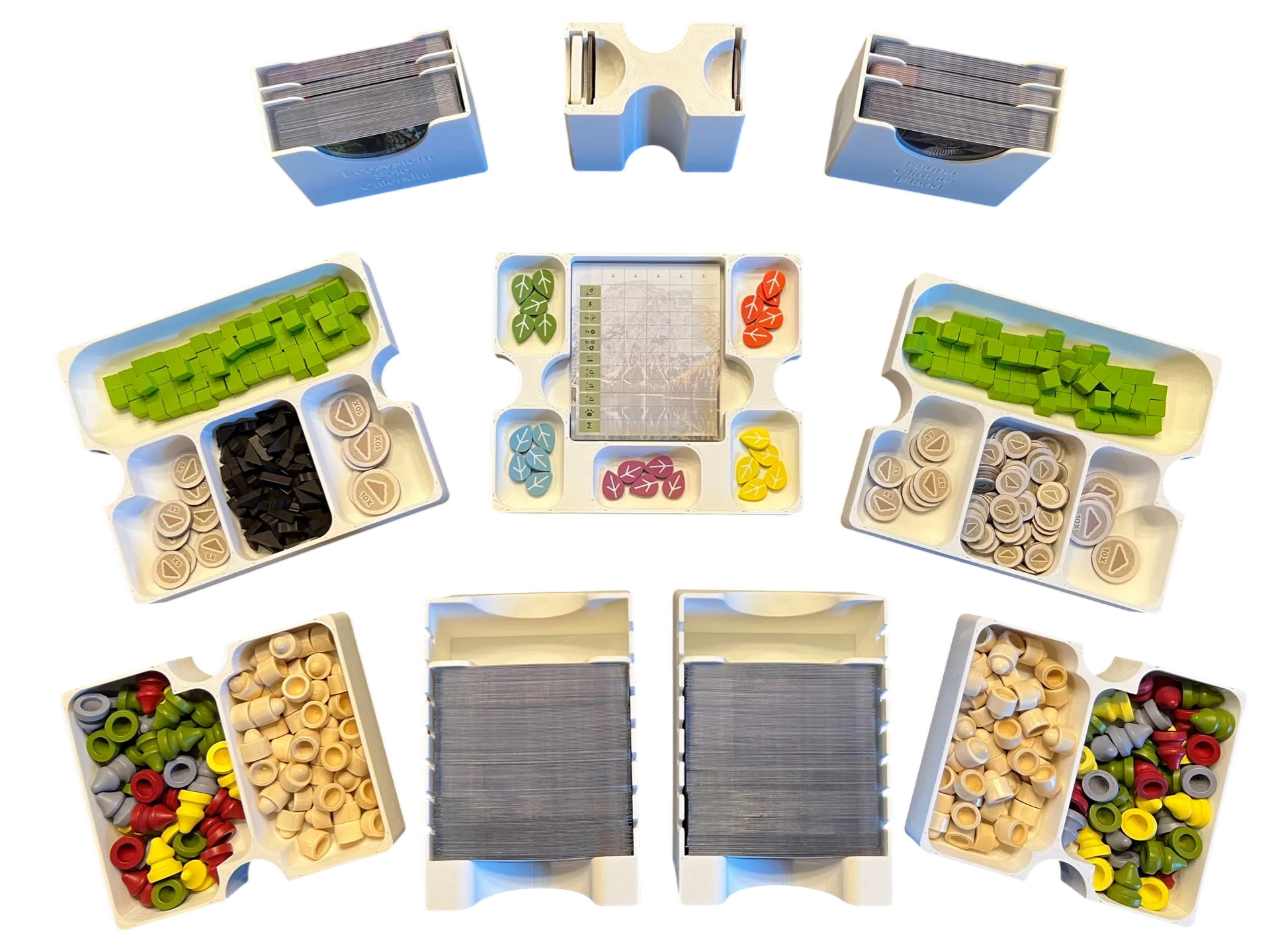 Funkcjonalny organizer zaprojektowany do gry Ziemia, mieszczący wszystkie komponenty – w tym drewniane ulepszenia z kampanii Kickstarter – w pudełku podstawowym.